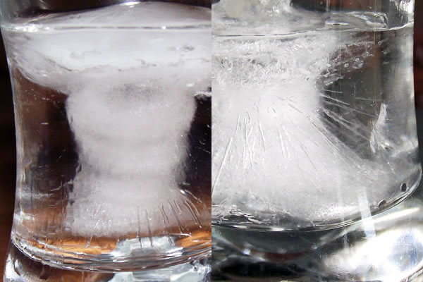 - Gli esperimenti sono stati condotti con dell’acqua di sorgente che ha subito una «bidistillazione», ciò perché v’è la necessità che il liquido sia il più puro possibile. La presenza di sostanze estranee disciolte (come ad esempio cloro, calcio, magnesio, ecc.) rende il congelamento meno omogeneo deformando le strutture interne del ghiaccio.