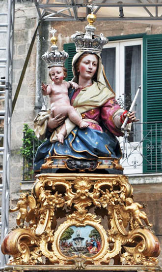 Accanto a San Michele, la religiosità popolare non poteva dimenticare la Madonna, personificazione della Madre Terra, che si prende cura dei suoi figli assicurando loro la fertilità e l’abbondanza per l’anno successivo.